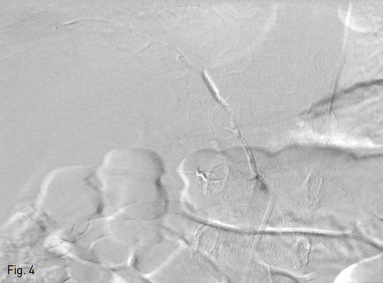 부신동맥에 대한 색전을 계획하였고 상, 중 부신동맥은 직경이 너무 작아 microcatheter를 통한 초 선택은 제한이 있을 것으로 판단되어 상, 중 부신동맥의 분지를 포함하는 오른쪽 아래가로동맥에 대한 색전을 계획하였다. 이에 2.0 Fr microcatheter (Progreat; Terumo, Tokyo, Japan)을 이용하여 오른쪽 아래가로막동맥을 초 선택 하였고 N-butyl-2-cyanoacrylate (histoacryl; B.Braun, Tuttlingen, Germany)와 Lipiodol (Guerbet, Paris, France) 1:4 혼합물을 이