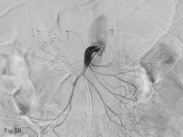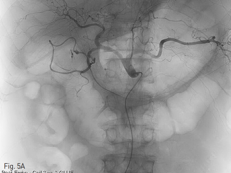 색전술 시행 후 복강동맥 (Fig. 5A), 위창자간막동맥 혈관조영술 (Fig. 5B) 모두에서 잔류 혈관외유출은 보이지 않았다.