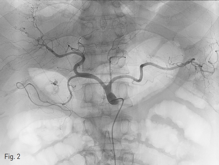 오른쪽 총대퇴동맥을 천자하여 5Fr sheath를 삽입하였다. 이후 4 Fr Yashiro catheter (Jung Sung Corp., Seoul, Korea)를 이용하여 복강동맥 (Celiac artery, Fig. 2) 과 위샘창자동맥 (Gastroduodenal artery) 혈관조영술을 시행하였으며 내시경 클립 주변으로 보이는 샘창자상부동맥 (supraduodenal artery)분지에서 가성동맥류를 동반한 혈관외 유출이 확인되었다 (Fig. 3).