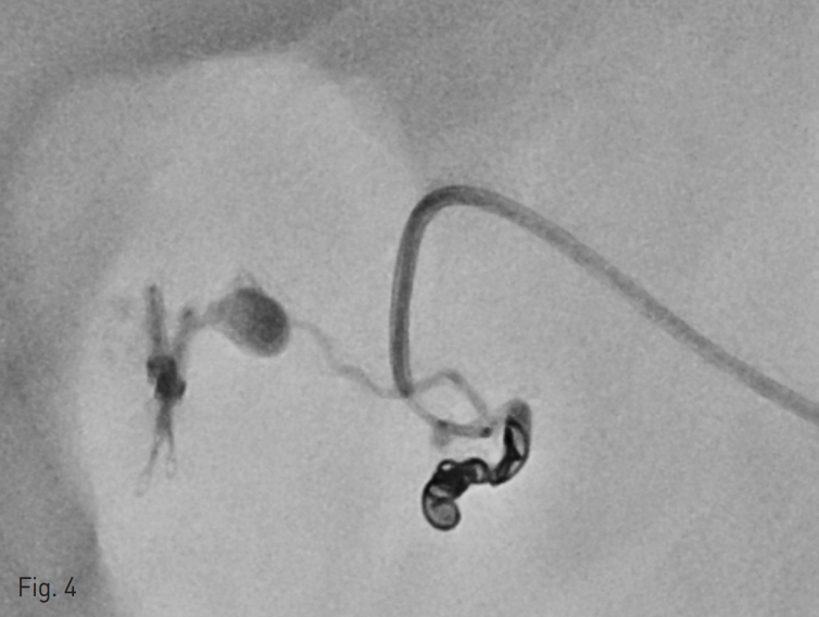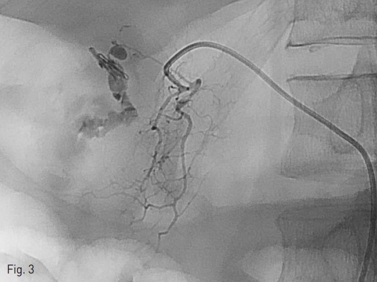 시술 중간 환자의 혈압이 떨어지기 시작하여 혈관외 유출이 있는 분지의 원위부인 위이자샘창자동맥(superior pancreaticoduodenal artery)을 microcoil 3개 (Tornado, Cook Medical, Bloomington, IN,USA)를 이용하여 막고 (Fig. 4) 근위부에서 n-butyl cyanoacrylate (NBCA; Histoacryl, B.Braun, Melsungen, Germany) + 요오드화 오일 (Lipiodol Ultra-Fluide, Guerbet, Paris, France)의 1:2.5 혼합액을 주사하여 샘창자상부동맥 (Supraduodenal artery)에 대한 색전술을 시행하였다.