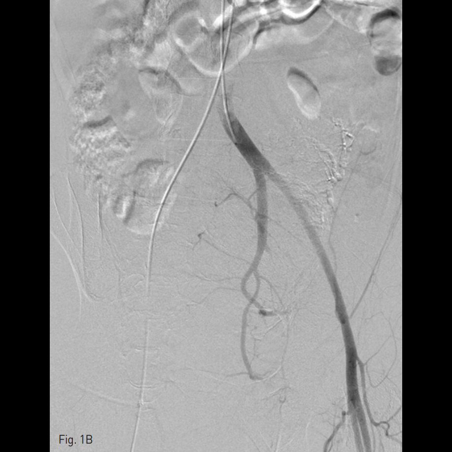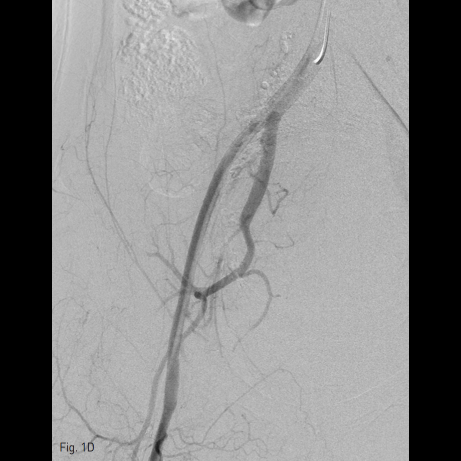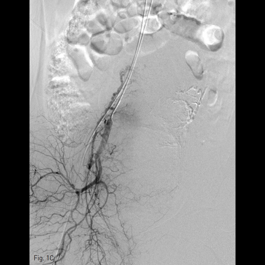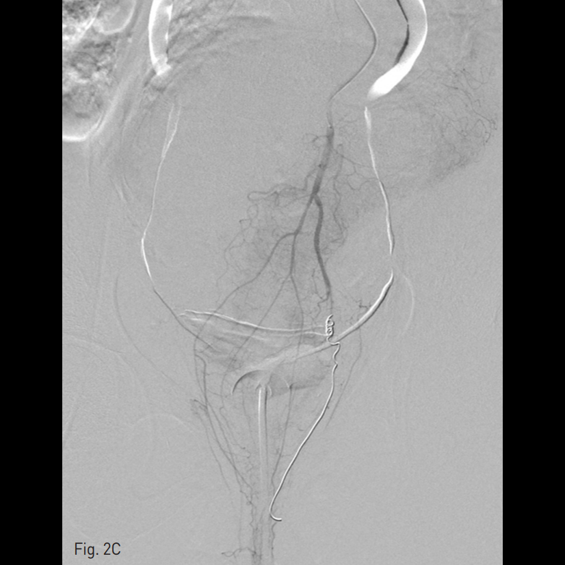 우측 총대퇴동맥을 천자하여 5 Fr sheath를 삽입하고, 5 Fr RUC catheter (Roberts Uterine Catheter, COOK medical, Bloomington, IN, USA)를 이용하여 좌측 내측 장골동맥을 선택하여 조영술을 시행한 뒤 좌측 자궁동맥을 선택하여 조영술 시행하였으며 (Fig. 1A), 출혈의심소견이 있어 gelfoam을 이용하여 색전술을 시행하였다 (Fig. 1B). 이후에 시행한 우측 내측 장골동맥을 선택하여 조영술을 시행한 뒤 (Fig. 1C), 우측 자궁동맥을 초선택하여 조영술을 시행하였을 때, 우측 자궁동맥이 비후되어 있어, gelfoam을 이용하여 색전술을 시행하였다. 색전술 직후 산부인과 진찰에서 지속적인 출혈소견이 보였다. 이에 5 Fr pigtail catheter를 이용하여, 대동맥 조영술을 시행하였다. 하장간막동맥 (Inferior mesenteric artery)으로 부터 출혈 소견이 관찰되었다 (Fig. 2A). 이에 대해서 2.2 Fr 마이크로카테터 (Progreat, Terumo, Japan)를 이용하여 하장간막동맥을 초선택하여 코일(Nester microcoil, COOK Medical, Bloomington, IN, USA)과 gelfoam (Spongostan, Ferrosan Medical Devices, Denmark)을 이용하여 색전술을 시행하였다 (Fig. 2B). 이후 다시 하장간막동맥 조영술을 시행하여 더 이상의 출혈이 없음을 확인하고 시술을 종료하였다 (Fig. 2C).