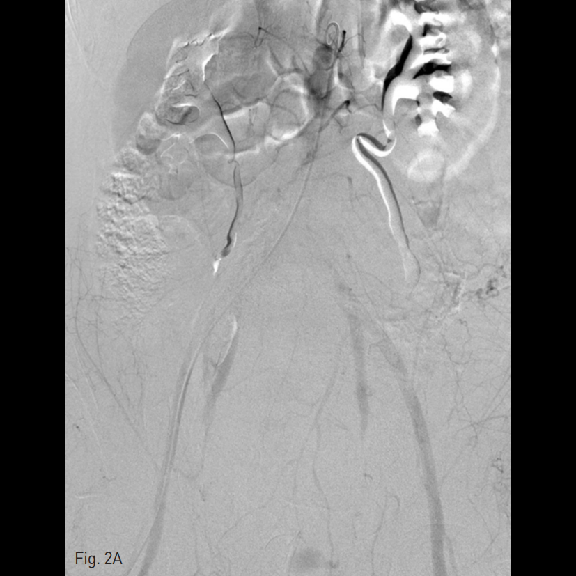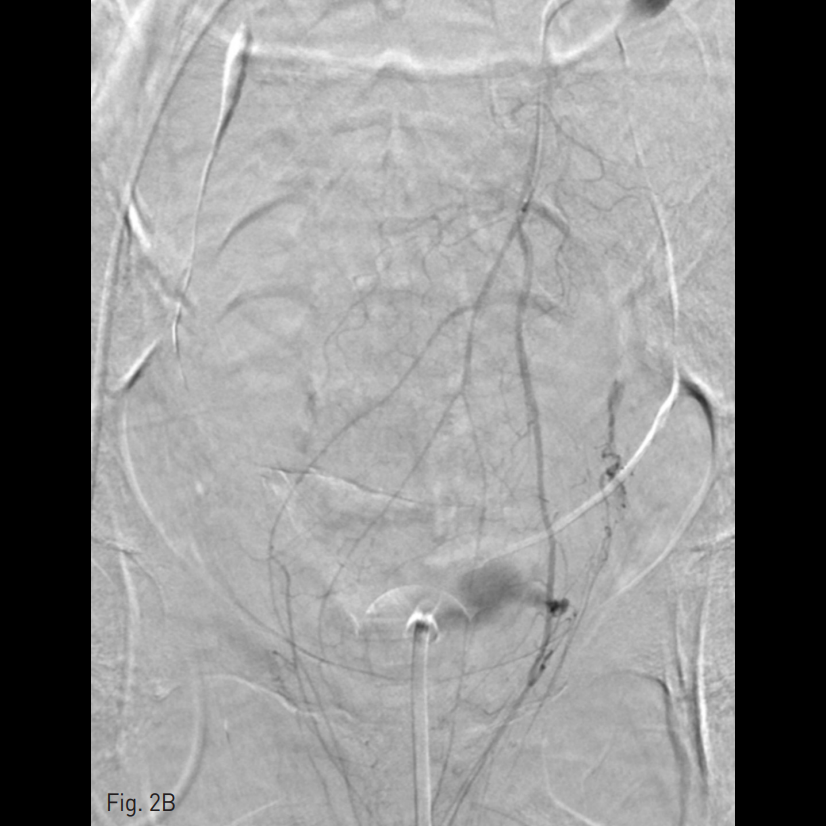 양측 내측 장골동맥을 선택하여 시행한 혈관조영술에서 양측 자궁 동맥이 심하게 비후되어 있으며, 출혈의심 소견이 보였다. 양측 외측 장골동맥 의 가지에서는 출혈 의심소견이 없었다. 대동맥 조영술에서는 하장간막동맥으로부터 출혈 소견이 보였다.