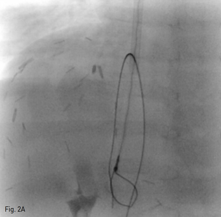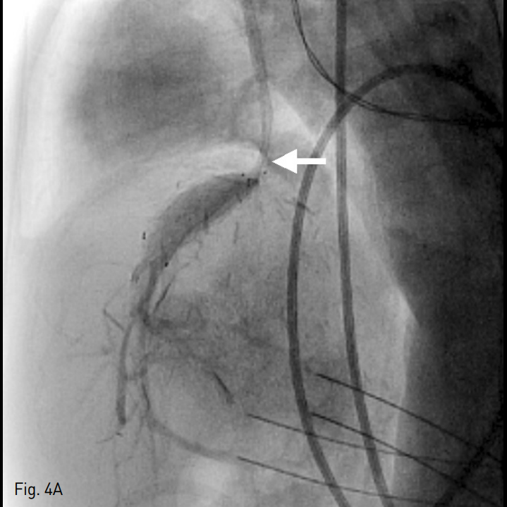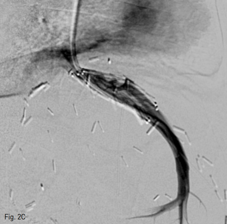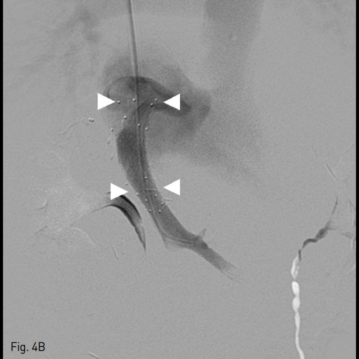 B. After additional stent inser tion (14mm x 30mm) and balloon angioplas ty (8mm x 40mm) at the anastomosis site the flow via the newly inserted stent (arrowheads: stent markers) to the right atrium restored, and the pressure gradient dropped from 19mmHg to 3mmHg.