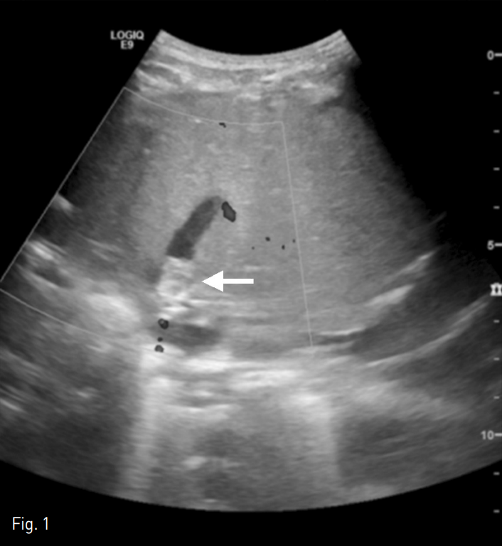 복부 초음파 검사에서 간정맥의 중심 부위에 에코성의 충만결손 병변이 관찰되며 이는 혈전으로 생각되었다. 도플러 검사 상 간 정맥 내의 혈류 신호가 감지되지 않았다 (Fig. 1).