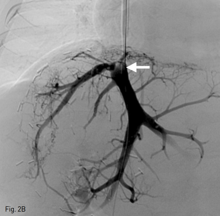 B. On hepatic venography, there was complete occlusion of the hepatic vein at the anastomosis site with a thrombus which was seen as a filling defect (arrow).