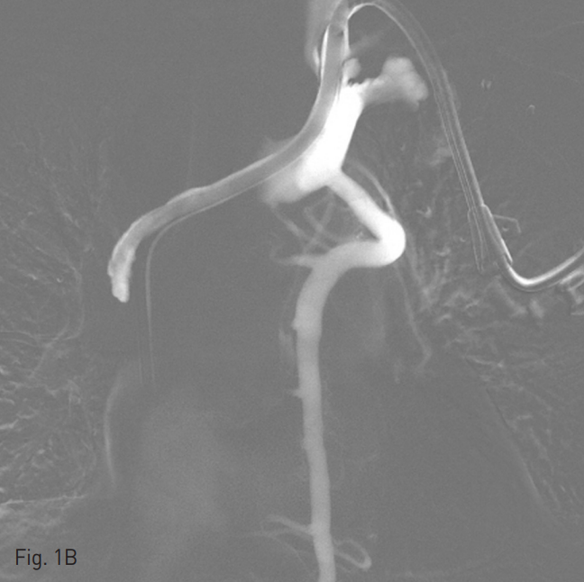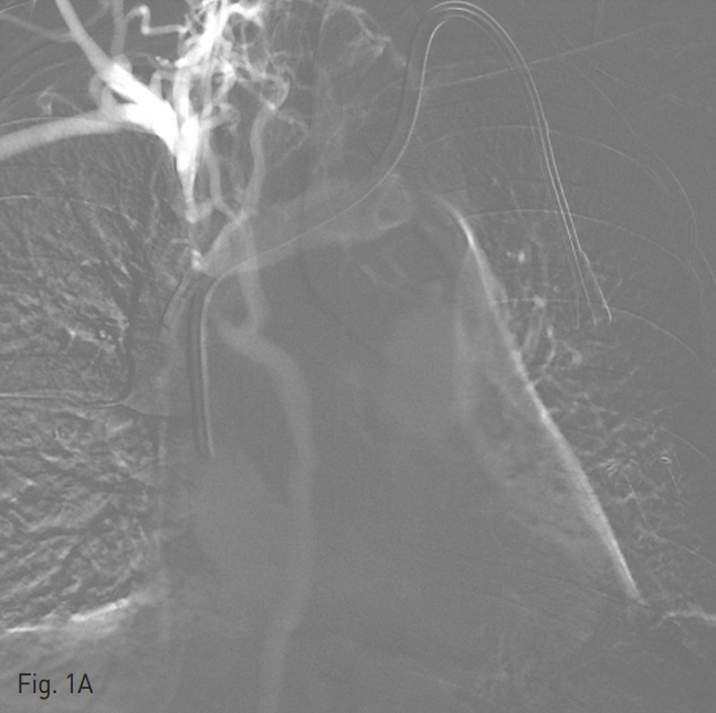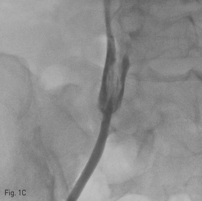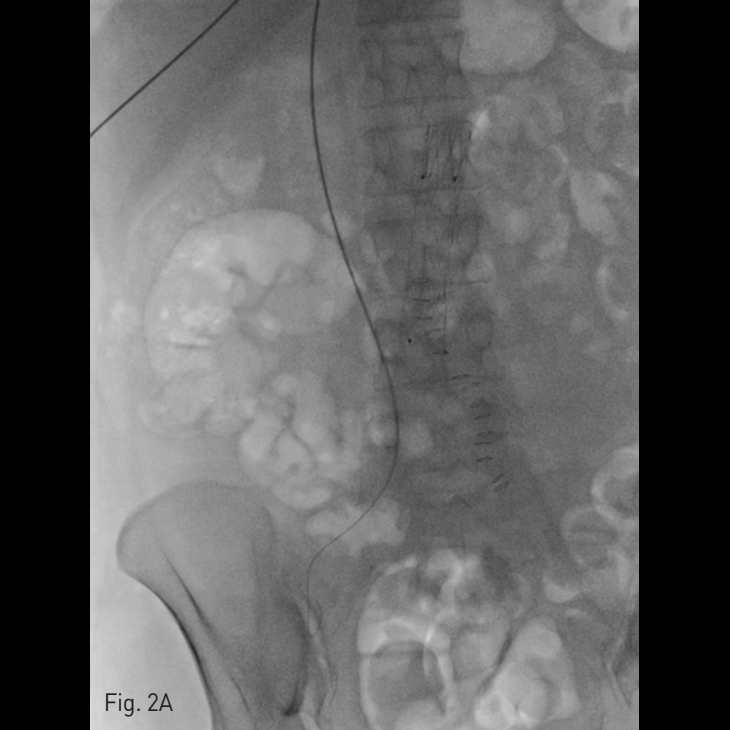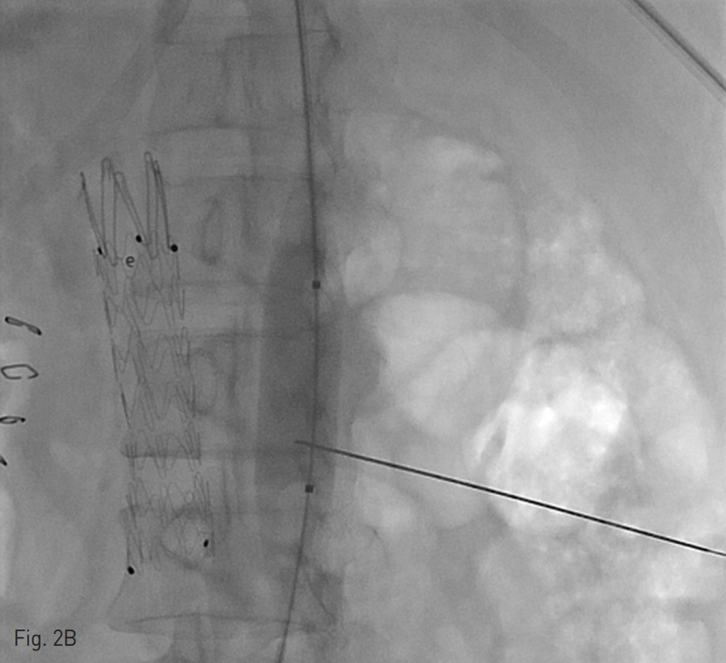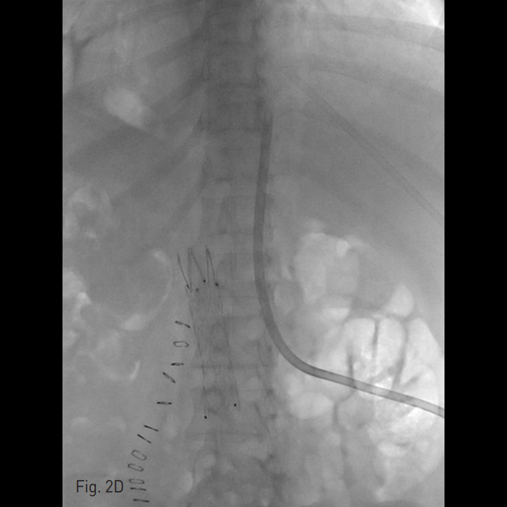 양측 내경정맥을 통한 정맥 조영술에서 상대정맥이 완전히 폐색되어 있으며 (Fig. 1A-B) 이를 대체하기 위해 우측 대퇴정맥에 투석용 카테터를 삽입하였지만 이 또한 10일 후 카테터 주변으로 혈전이 발생하였다(Fig 1C). 이어서 허리 경유 접근을 통해 투석용 카테터 삽입을 위해 하대정맥 천자를 시도하였으며 6 Fr sheath까지 들어간 후에 천자된 곳이 대동맥임을 알게 되어 대동맥에 stent-graft를 넣었다 (Fig. 2A). 투석이 급하여 일단 간정맥을 통하여 투석용 카테터를 삽입하였으나 (Fig. 1D) 이 역시 혈전으로 인한 기능 부전으로 수 차례 교환술을 시행하였다.