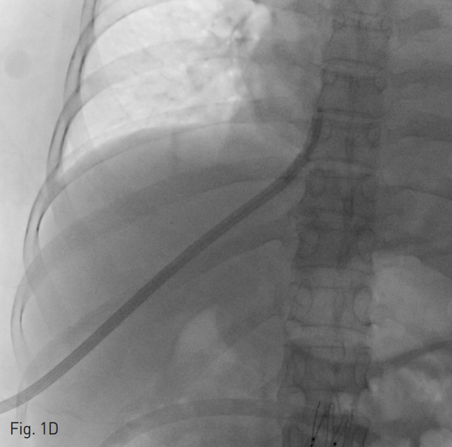 D. After failure of translumbar approach, the tunneled dialysis catheter was inserted through the right hepatic vein.