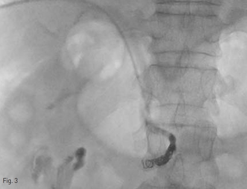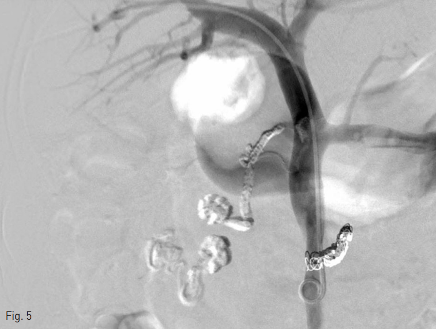 이에 N-buty1-2-cyanoacrylate (Histoacryl; B. Braun, Tuttlingen, Germany)와 Lipiodol(Guerbet, Paris, France) 1:2 혼합물을 이용하여 색전술을 시행하였고, 이 과정 중 색전물질 일부가 문맥전신단락을 통해 유출되는 것이 확인되었다. 그러나 이후 추적 조영술에서 문맥전신단락을 통한 조영제 유출은 확인되지 않아 PVA particle (Contour; Boston scientific, Natick, USA)를 통한 추가 색전술을 시행하였고 microcoils 5개 (Interlock and Tornado; Cook, Bloomington, USA)을 이용하여 영양혈관의 근위부에 색전술을 시행하였다 (Fig. 3).