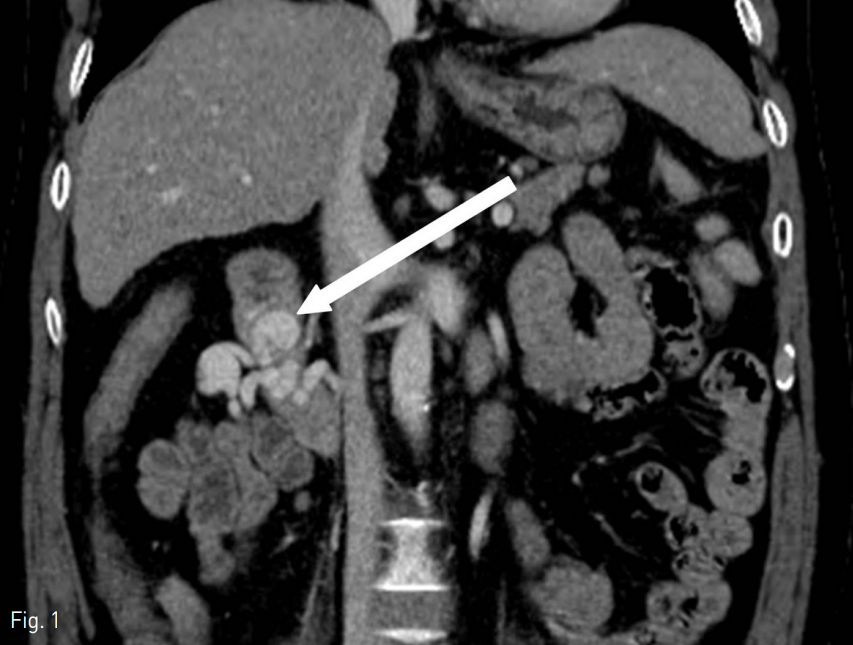 컴퓨터단층촬영상 최대 직경 약 2cm의 낭성 확장 두개를 포함한 정맥류가 십이지장 제이부에 관찰이 되었으나 활동성 출혈은 관찰되지 않았다 (Fig. 1).