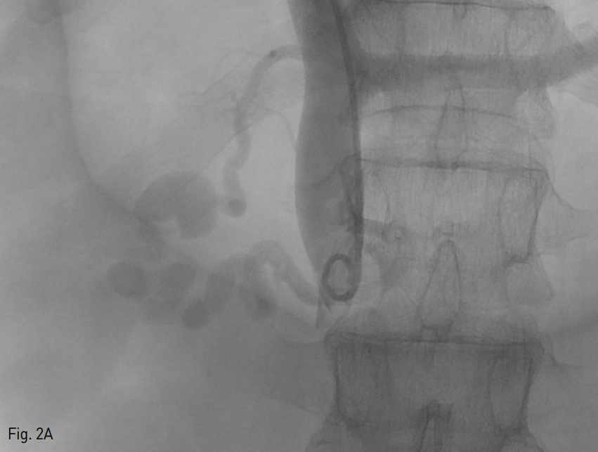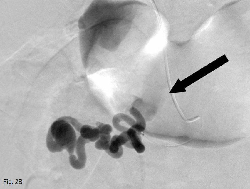 초음파 유도하 우측 간문맥을 천자하여 5 Fr sheath (Terumo, Tokyo, Japan)를 삽입하였고, pig-tail catheter (Cook, Bloomington, USA)을 이용하여 시행한 간문맥 조영술 시행하였다. 간문맥 조영술상 최대 직경 2cm의 낭성 확장 및 두 개의 영양혈관을 가진 정맥류가 확인되었다 (Fig. 2A). 이후 5 Fr cobra catheter (Terumo, Tokyo, Japan) 및 2.2 Fr microcatheter (Progreat; Terumo, Tokyo, Japan)을 이용하여 아래쪽 영향혈관을 초선택 하였고, 시행한 조영술 상 오른쪽 신정맥을 경유하여 하부대정맥으로 배액되는 문맥전신단락 (portosyste mic shunt)도 확인되었다 (Fig. 2B).