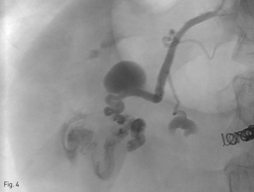 또한 상부 영양혈관을 마이크로 카테터로 초선택하여 조영술을 시행하였고 (Fig. 4), 시행한 조영술 상 조영제의 저류가 관찰되어 glue와 Lipiodol 혼합물을 이용해 색전술을 시행하였다.