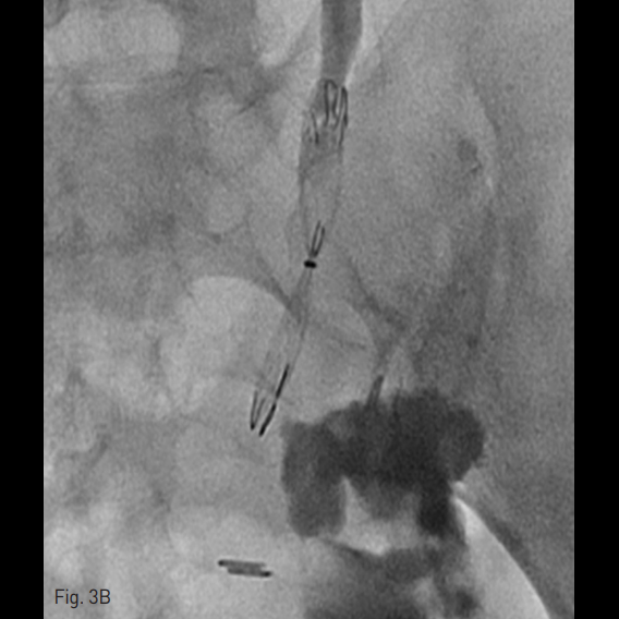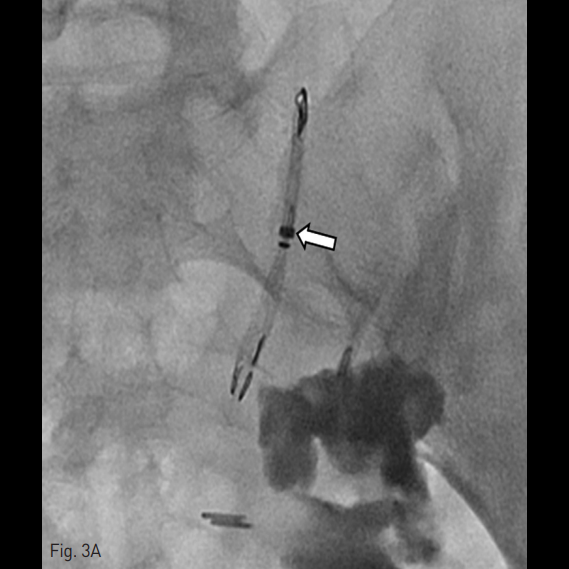 성공적으로 스텐트를 위치시킨 것이 확인된 후 (Fig. 3A) 조영제를 재주입하여 추가적인 누출이 없는 것을 확인하였다 (Fig. 3B).