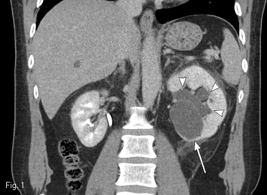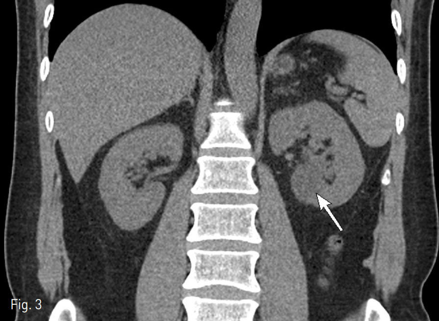 51세 남자환자가 좌측 옆구리 통증을 주소로 응급실에 내원하였다. 10년 전에 요로결석으로 치료받은 적이 있었으나 그 외 특이병력은 없었다. 이학적 검사상 좌측 옆구리 통증 외에 특이소견은 없었다. 혈액검사 및 요검사에서도 특이소견은 없었다. 요로결석 의심 하에 복부 CT를 촬영하였다.