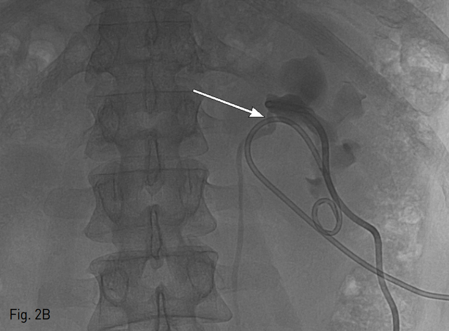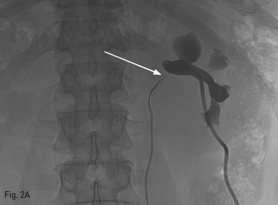 환자를 복와위로 눕힌 상태에서 초음파 유도 하에 21G Chiba needle을 이용하여 확장되어 있는 신배 (renal calyx)를 천자하고 0.018 inch hair wire를 삽입한 후 Yellow sheath (A&A M.D, Sungnam, Korea)를 이용하여 0.035 inch 유도철사 (0.035" hydrophilic guide wire, Terumo, Tokyo, Japan)로 guide wire를 교체하였다. 8.5 Fr pig tail catheter (Dawson-Mueller Drainage Catheter, Cook Medical, Bloomington, IN, USA)를 삽입하여 nephrostomy를 시행하였다. 선행성 요로조영술 (antegrade pyelography)를 시행했을 때 요관신우연결부위에 심한 협착과 함께 환자가 통증을 호소하였다 (Fig. 2A). 이후 다시 초음파 유도 하에 좌측신장의 단순낭종 내에 위에서 언급한 방법과 동일한 방법으로 배액관을 삽입한 뒤 단순낭종 내 있던 액체 40cc를 흡인하였다. 다시 선행성 요로조영술을 시행하였을 때 이전에 보이던 협착은 소실되었고 요관을 따라서 조영제가 잘 내려가는 것을 확인하였다 (Fig. 2B), 이를 근거로 요관 신우연결부위의 협착이 단순낭종에 의한 것임을 확인할 수 있었고 20cc의 99% 알코올을 이용하여 경화요법을 시행하였다.