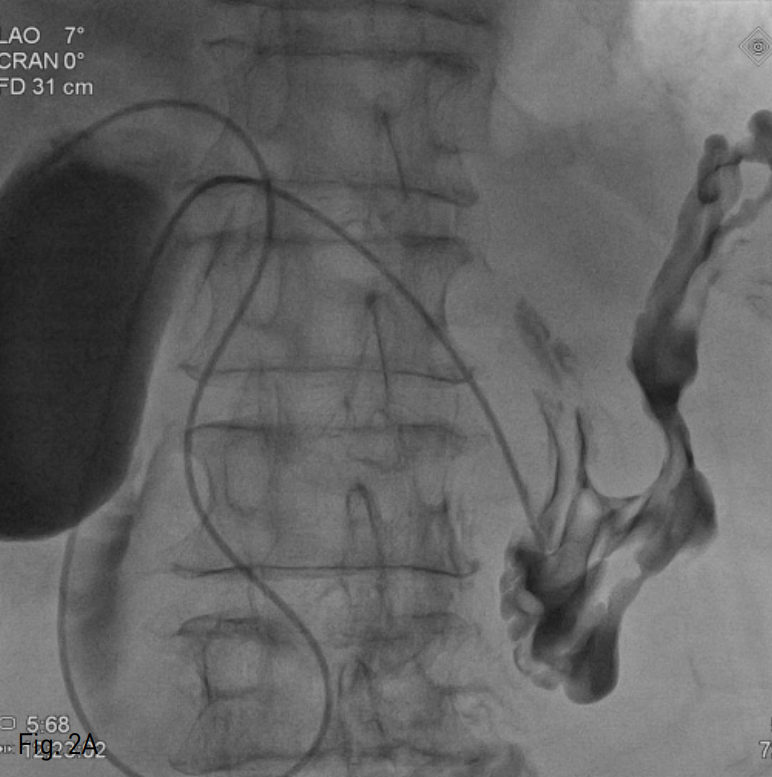 A. Fluoroscopic image shows retrograde passage of air insufflation catheter through percutaneous transhepatic gallbladder drainage to the stomach.