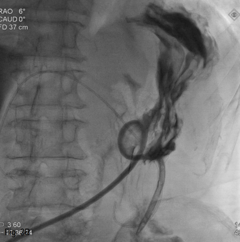 먼저 위 공기 팽창을 위해 Gastro-tube를 삽입하려고 시도하였으나 하인두 이하로 진입이 불가능 하였다. 초기 투시경 사진상 장시간의 금식으로 인해 위장은 허탈되어 있고, 횡행 결장의 공기 음영이 상복부에 위치하여, 위 공기 팽창이 필수적이라고 생각되었다. 먼저 술자의 이전 경험에 비추어 22G Chiba needle과 hairwire (A&A medical, Seoul, Korea)를 이용하여 우측 간내 담관을 천자하여 위내 공기 팽창용 catheter를 삽입하려 하였으나, 환자의 척추 후만증으로 인한 자세불안정과 늘어나지 않은 상태의 정상 우측 담관 구조로 인해 천자에 실패하였다. 그래서 초음파 유도하에 담낭을 천자하여, 5 Fr angio-sheath (Terumo, Tokyo, Japan)를 설치하였다. Sheath를 통하여, 다시 0.035 inch guide wire (Terumo, Tokyo, Japan)와 5Fr Cobra catheter (Cook, Bloomington, IN,USA)를 이용하여 후향적으로 위 분문부에 진입하였다 (Fig.2A). 실내 공기 500cc를 주입하여 위를 팽창시킨 후 약간의 조영제를 주입하여 위벽 주름을 조영하였다. 다시 복벽을 리도카인을 이용하여 국소 마취한 후, 복직근 외연부 라인에서 적당한 위 분문부를 위저방향으로 22G Chiba needle과 hair wire (A&A medical, Seoul, Korea)를 이용하여 위 주름이 밀리는 것을 관찰하며 천자하였다. 다시 4 Fr sheath (Cook, Bloomington, IN, USA)를 거치한 후 T자형 고정 장치를 삽입하였고, 통상적인 위창냄술의 방법대로 경로를 확장하였다. 12 Fr 위창냄술 튜브 (Cook, Bloomington, IN, USA)를 삽입하고, 조영제를 주입하여 튜브의 위치와 기능, 복강 내로 유출이 있는지를 확인하였다 (Fig. 2B). 마지막으로 T자형 고정장치와 튜브를 피부에 고정하였고, 이후 담낭 내에 8.5 Fr Pigtail catheter (Cook, Bloomington,IN,USA)를 거치 한 후 시술을 종료 하였다.