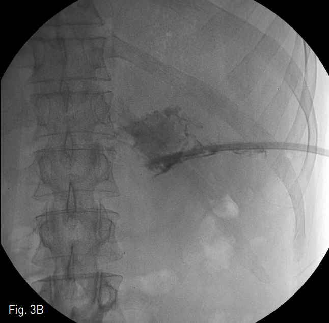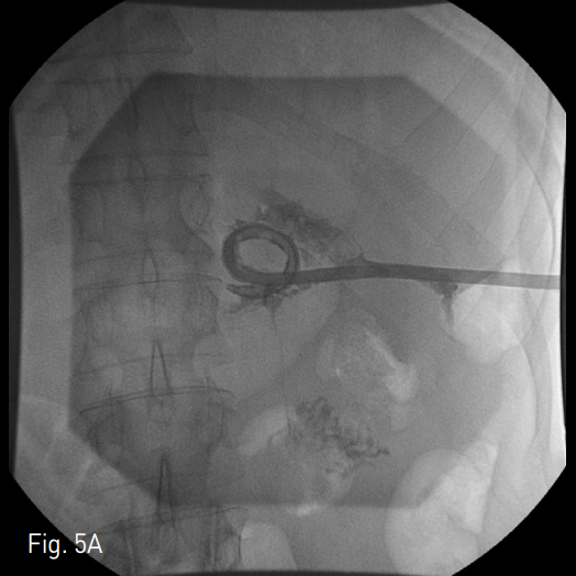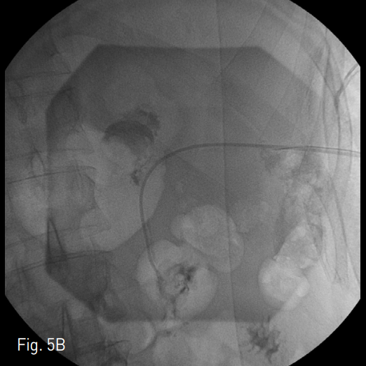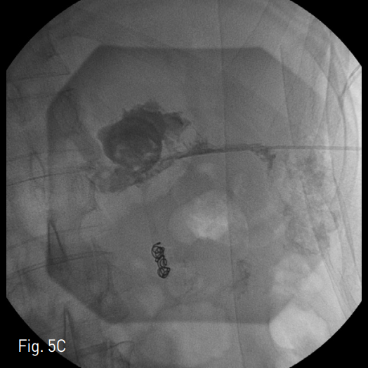Lipiodol Ultra Fluride (Guerbet, Roissy, France)의 혼합물을 이용하여 색전술을 시행하였음. 이후 조영제를 주입하였을 때 더 이상 소장으로의 샛길은 보이지 않아 Nelaton catheter를 이전의 삽입경로에 일시적으로 거치한 후 시술을 종료하였음 (Fig. 5).