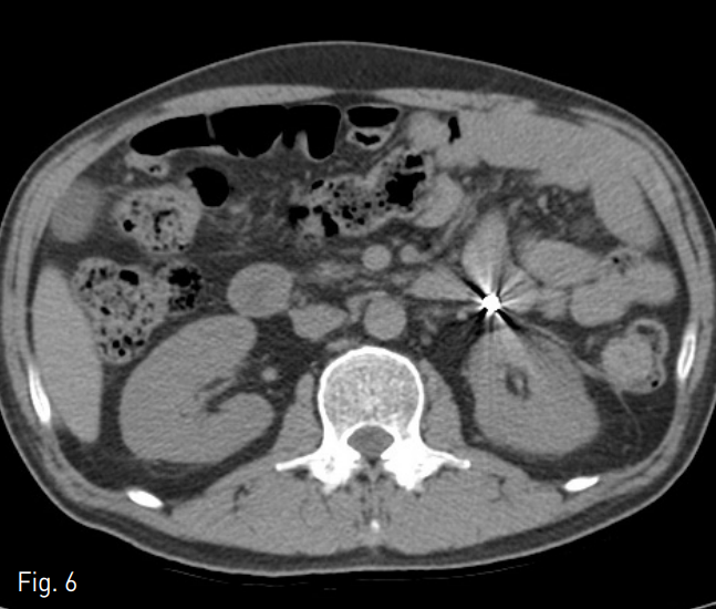 마지막 시술 3주 뒤 외래에서 시행한 경과 관찰 비조영 전산화 단층촬영에서 이전에 보이던 췌장주위구역과 전방콩팥주위공간에 구획화된 액체 저류나 오른 결장주위 공간의 액체 저류는 보이지 않음. 이전 색전술이 시행된 소장의 주위로도 누출을 시사하는 비정상 액체 저류는 보이지 않았음 (Fig. 6).