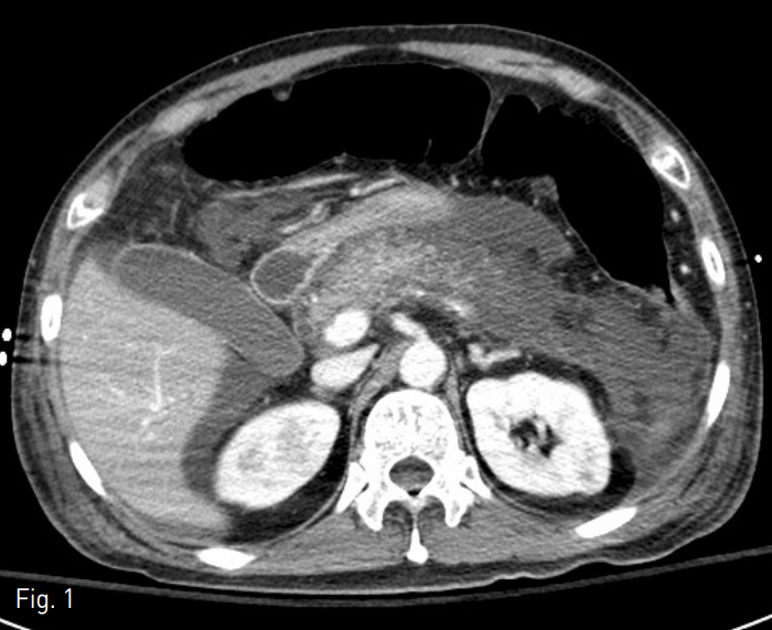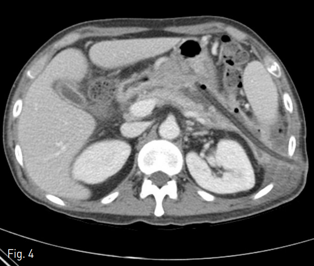 응급실 내원 후 시행한 전산화 단층촬영에서 비교적 정상실질의 고음영이 유지되어 있는 췌장 두부와는 달리 췌장 경부, 체부에는 경계가 정확히 그려지지 않는 저음영 구역이 보이고 있으며 조영 증강의 정도도 떨어지는 것이 보임. 이와 더불어 췌장주위구역과 전방콩팥 주위공간에 구획화된 액체 저류가 있고 오른 결장주위 공간으로도 액체 저류가 보이고 있음. 해당 액체 저류들이 경계가 매우 잘 그려지는 격막에 둘리싸여 있지는 않았으나 주변 복막이 상대적으로 두꺼워 보이면서 미약한 조영 증강도 보이고 있어 감염된 액체 저류의 가능성이 있을 것으로 생각되었음. 이와 더불어 장이 전체적으로 공기에 의해 늘어나 있는데 장마비가 동반되어 있는 것으로 보임. 이와 같은 소견은 급성 괴사성 췌장염과 이에 동반된 췌장 주위 액체 저류의 소견임 (Fig. 1). 전산화 단층촬영에서 방사선비투과성 담석은 보이지 않았으며 췌장 동맥의 거짓동맥류도 없었음.