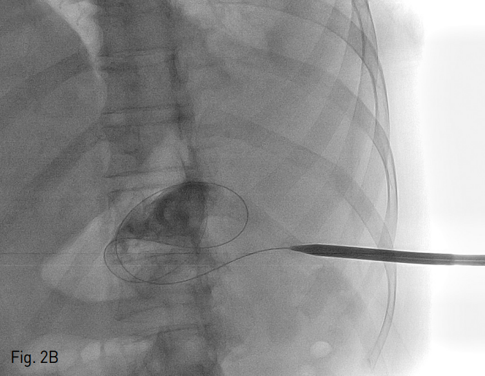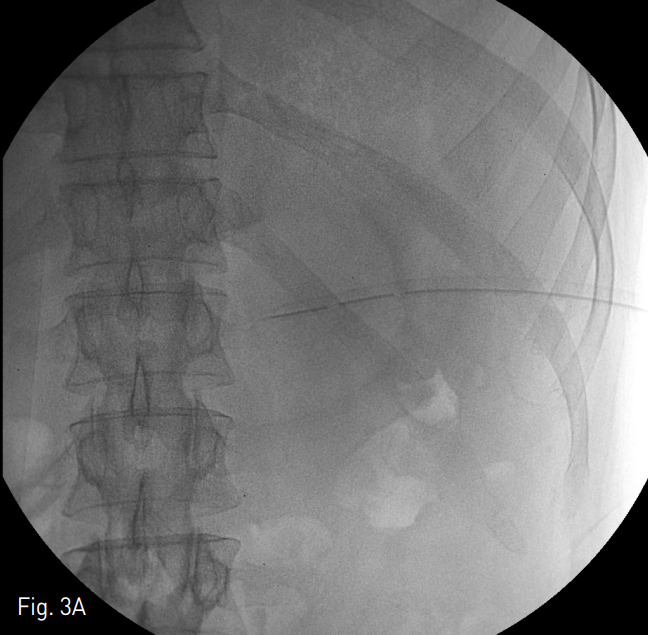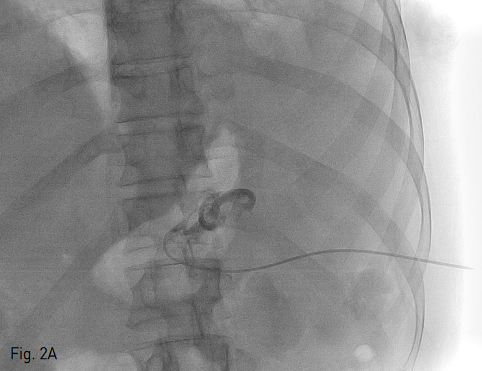 초음파 유도하에 왼쪽 측와위에서 췌장 미부 주위 액체 저류를 조준하여 22 gauge Chiba needle로 천자하였음. 조영제를 주입하여 액체 저류 안에 들어온 것을 확인하고 차례로 확장기를 진입시킨 후 18 Fr Thal-Quick chest tube (Cook, Bloomington, IN,USA)를 거치하였음 (Fig. 2). 이후 냄새가 나는 연갈색의 농이 배액되어, 카테터를 배액용기에 연결한 후 시술을 종료 함. 이후 2개월간 11번 동안 혈관조영실을 방문하여 평균 8000cc정도의 생리 식염수를 이용한 적극적인 세척과 함께 50cc 관장용 주사기로 흡인하여 괴사 제거술을 시행하였음 (Fig. 3). 출혈을 피하기 위해, 괴사 제거술은 흡인으로 쉽게 제거되는 괴사물 정도에 대해서만 국한하여 시행하였으며, 과도한 유도철사의 움직임은 최소화하였음. 흡인물에서 육안으로 신선 혈액이 확인되는 경우는 바로 시술을 종료하였음. 2개월 뒤 추적 전산화 단층촬영술 축상면 영상에서 삽입되어 있는 도관과 함께 주변 괴사 조직과 액체 저류가 양이 매우 감소한 것을 확인하였음 (Fig. 4). 당시에도 거짓동맥류 등의 중요 합병증은 보이지 않았음. 이에 14 Fr MSL catheter (Cook, Bloomington, IN, USA)로 교체하여 배액을 마무리하기로 하였음. 이후 조영제를 주입하였을 때 소장과의 샛길이 보였고 통제된 샛길 (controlled fistula)를 형성하기 위해 1주일간 카테터를 유지하기로 하였음. 1주일 뒤에 환자 이전의 발열 및 복통 증상이 호전되어 다시 악화되지 않음을 확인한 후 유도철사와 5 Fr KMP catheter (Cook, Bloomin gton, IN, USA)를 이용하여 샛길의 경로를 조영제로 확인하고 4mm MicroNester (Cook, Bloomington, IN,USA)와 Histoacryl (B. Braun, Melsungen, Germany),