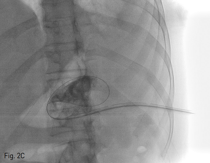 Fistula between fluid cavity and jejunum was noted (A). Successful navigation to fistula tract was done with 0.035inch hydrophilic guide wire and 5 Fr KMP catheter (Cook, Bloomington, IN, USA) (B). Controlled fistula tract was embolized with 4mm Tornado (Cook, Blooming ton, IN, USA) and Histoacryl (B. Braun, Melsungen, Germany), Lipiodol Ultra Fluride (Guerbet, Roissy, France) mixture. Post-embolization tubogram showed no demonstation of previous fistula. Nelaton catheter was deployed to formation of con trolled fistula (C). 1 week later, bedside removal of Nelaton catheter was done.