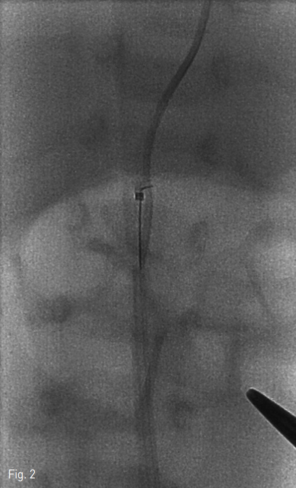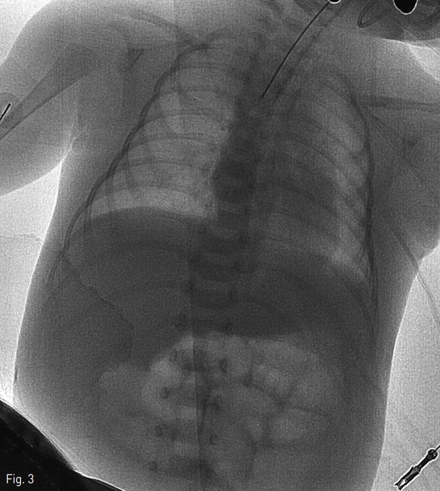 환아는 인터벤션 시술실로 이동하였고 18G 주사침으로 제대정맥을 천자하였으며 조영제를 주입하여 성공적인 천자와 제대정맥관의 위치를 확인하였다. 0.035-inch 유도철사를 넣고 주사침을 5 Fr 소아용 혈관초(Cordis, Miami, FL, USA)로 교체하였다. 이후 10mm의 직경을 가진 Amplatz gooseneck snare kit(EV3, Plymouth, MN, USA)를 제대정맥 내로 주입하였다. 이후 조심스런 여러 번의 시도 후에 제대정맥관의 끝부분을 잡는 것에 성공하였고 천천히 제대정맥 바깥쪽으로 제거하였다 (Fig. 2). 제대정맥관의 성공적인 제거는 투시화면상으로도 확인하였다 (Fig. 3).
