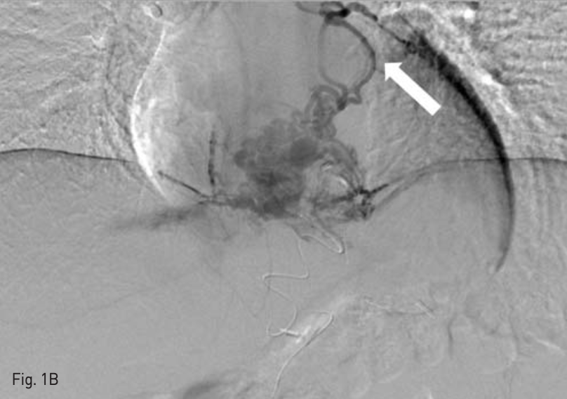 이후 feeder를 microcatheter(Progreat, Terumo, Tokyo, Japan)및 microwire(Transcend. Cook medical, Bloomington, IN, USA)를 이용하여 selection하여 1:5 and 1:8 NBCA - lipiodol mixture를 이용하여 embolizalion 시행하였는데, 소량의 NBCA - lipiodol mixture가 pulmonary artery로 migration한 것이 보였다(Fig. 1B).