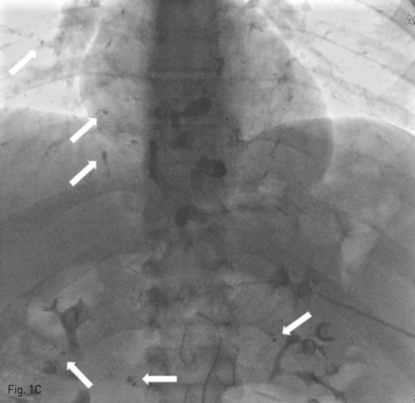 C. After injection of NBCA - lipiodol mixture, a radiographic image shows systemic embolism of NBCA - lipiodol to bilateral pulmonary artery and omental artery territory(arrows).