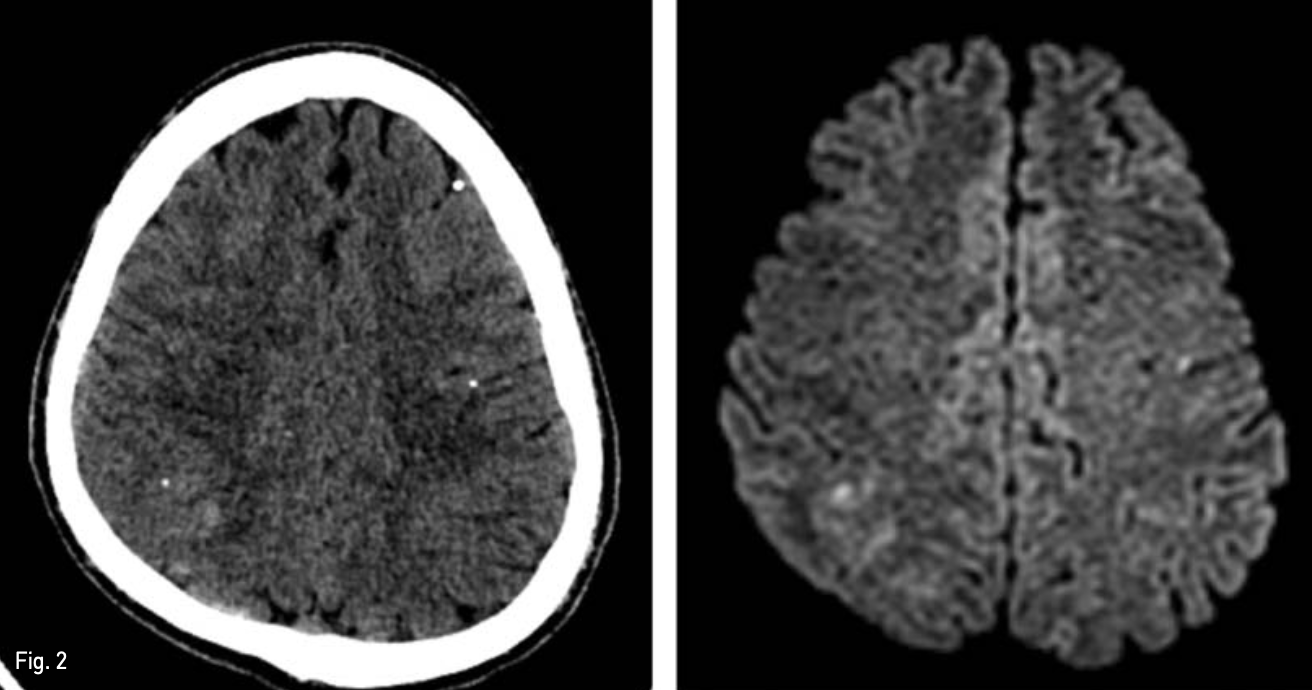 An axial CT scan obtained 1 day following embolization, shows multifocal scattered lipiodol density in brain (left), and Diffusion weighted brain MR shows multiple diffusion restriction spot suggesting acute in farction (right).