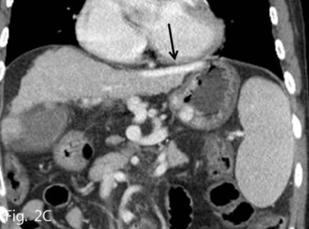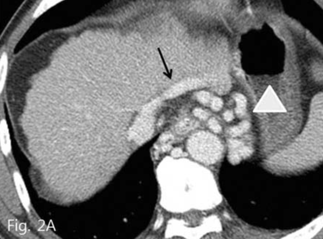 복부 전산화 단층촬영(CT)에서 간경화 및 비장비대의 소견과 함께 위식도 정맥류가 관찰되었다. 위정맥류의 경우 위신 단락 (gastrorenal shunt)은 보이지 않았으며, 대신 현저하게 늘어나 있는 위하대정맥 단락 (gastrocaval shunt)이 확인되었고 이것이 위정맥류의 주 유출정맥으로 생각되었다(Fig. 2A-C).