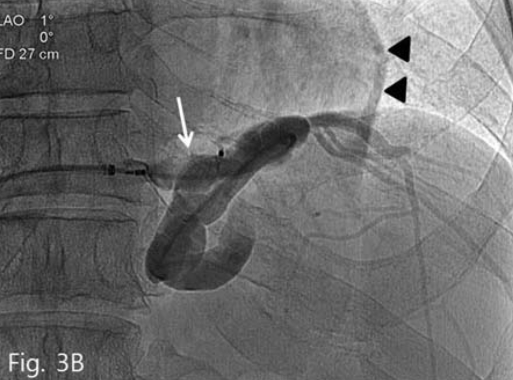 B. Vascular plug placement (arrow) is performed in gastrocaval shunt Left inferior phrenic vein and pericardial vein (arrowhead) is more prominently visualized.