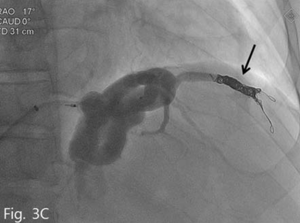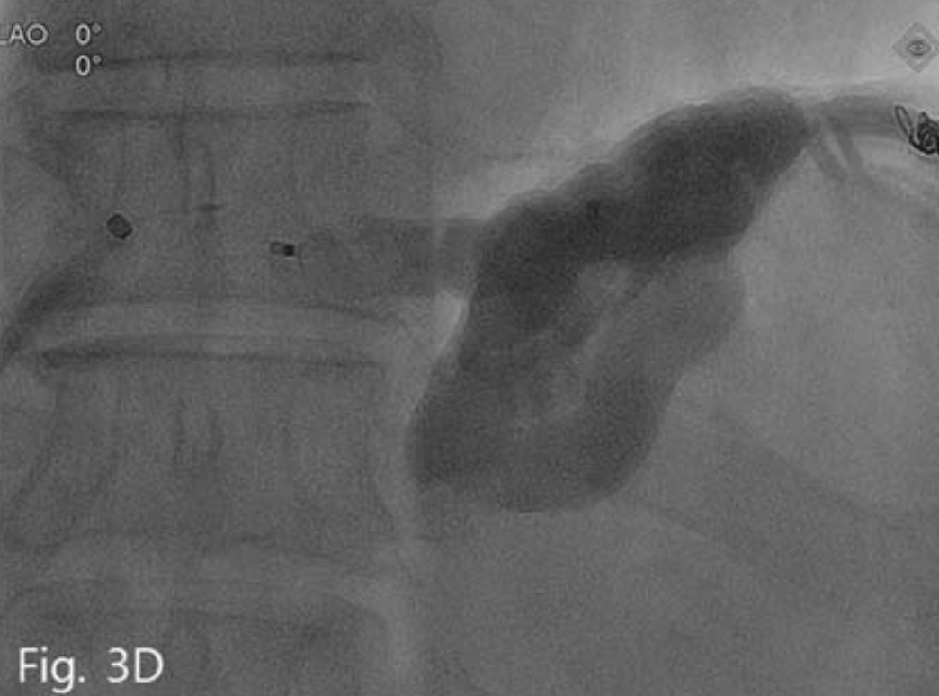 16mm vascular plug II(Amplatzer Vascular plug; AGA Medical, Golden Valley, Minn)를 삽입하였다. 그 후 wire를 따라 5-Fr catheter를 vascular plug를 지나 위치시키고 정맥조영술을 시행하였으며 주 유출정맥인 위대정맥단락은 막혔으나 대신 심장막정맥을 통한 곁가지 정맥배출이 좀 더 명확해졌다(Fig. 3B), 그래서 4개의 microcoil(Vortex; Boston Scientific, Cork, Ireland)로 이를 색전하였다(Fig. 3C). 그 후 5-Fr catheter를 통해 gelatin sponges(Gelfoam: