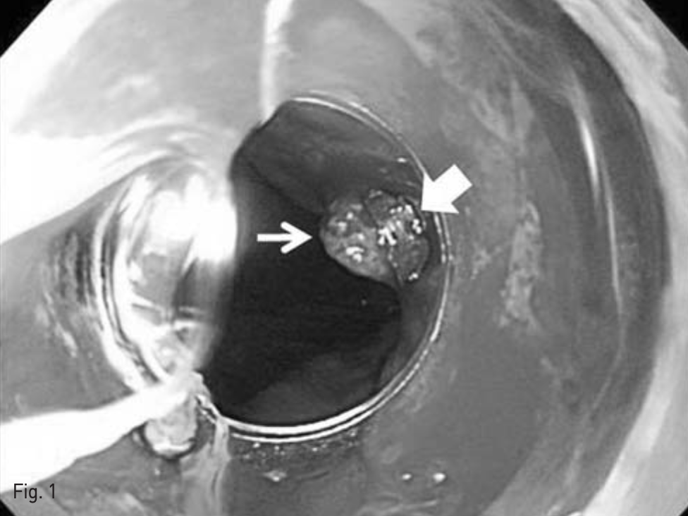 Esophagogastroduodenoscopy and vascular ligation. Active esophageal variceal bleeding was noted (thin arrow).