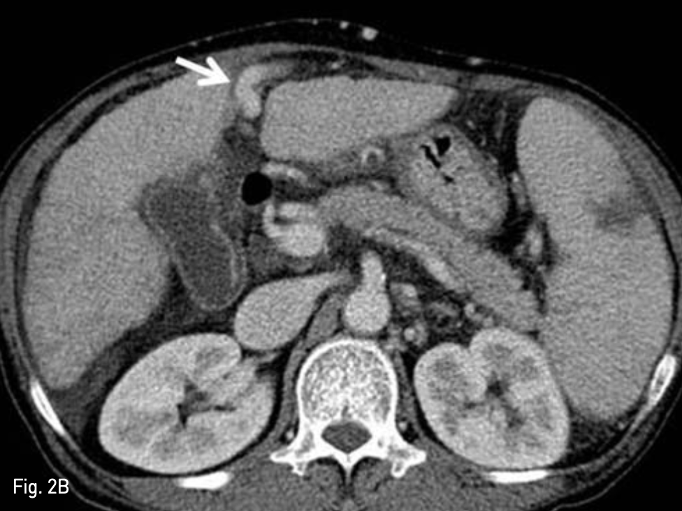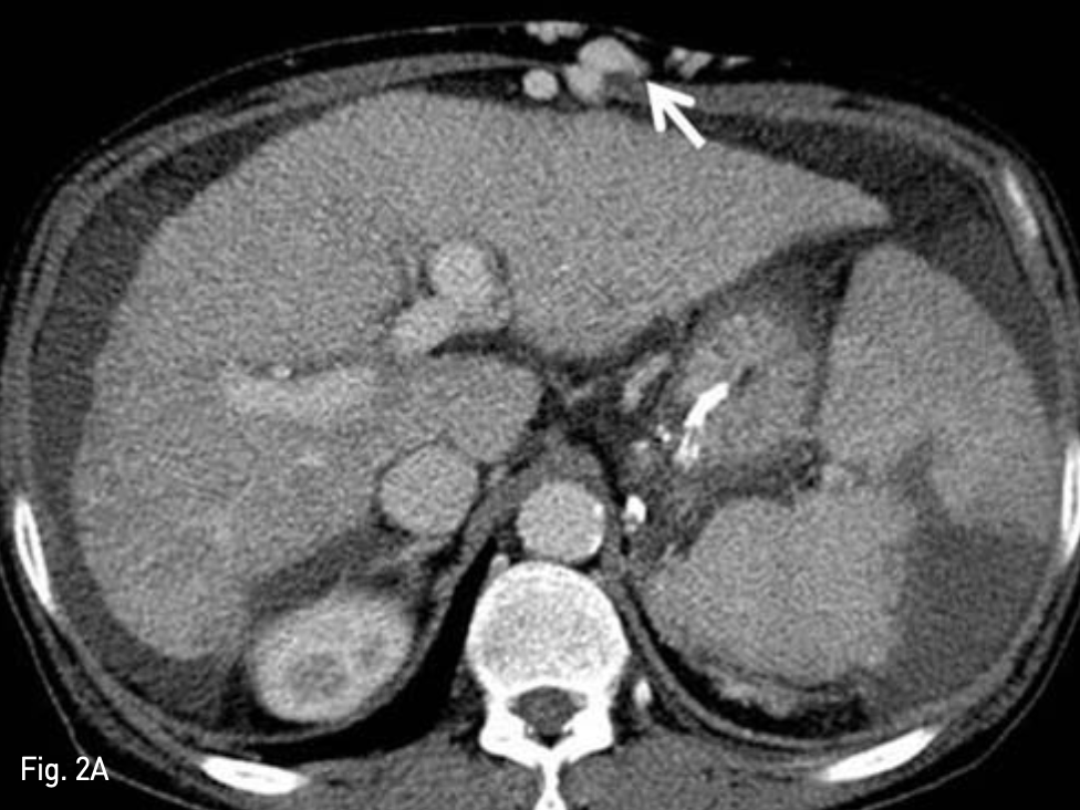 A. Venous phase CT image revealed dilated recan alized paraumbilical vein in abdominal wall (arrow)