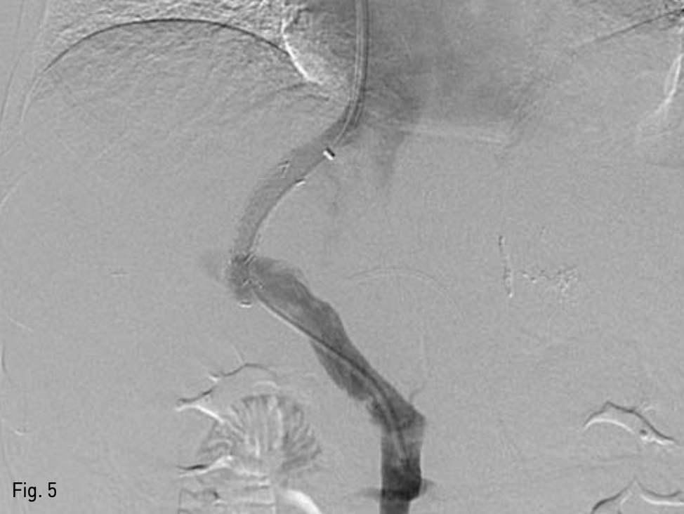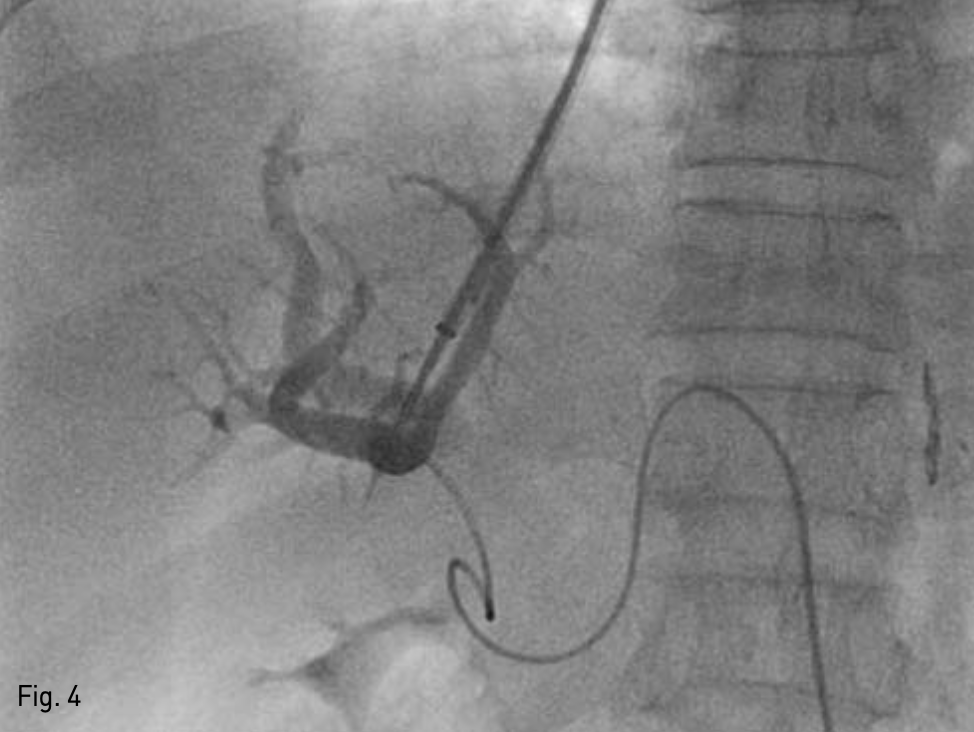 복벽에 확장되어 있는 recanalized paraumbilical vein을 초음파 유도하에 천자하여(Fig. 3), 왼쪽 문맥 으로 5-Fr 카테터를 삽입하였다. 문맥조영술을 시행하여 간내문맥을 확인하였다. Right intrnal jugular vein을 천자하여 5-Fr 카테터를 삽입하여 오른쪽 간정맥 조영술을 시행하고 오른쪽 간정맥을 신택한다. 이후 recanalized paraumbilical vein을 통한 문맥조영술 을 roadmap으로 이용하여 16G Colapinto needle (Cook Inc, Bloominglon, IN, USA) 오른쪽 간문맥을 천자하였다(Fig. 4). 천자된 경로를 6mm x 4cm balloon (Mustang, Boston Scientific, Massachusetts, USA)을 이용하여 확장하고, 10mm x 5cm partially covered stent (Niti-s TIPS Stent, Tae Woong medical, Gyeonggi-do, Korea)를 간문맥과 중간간정맥 샛길에 삽입하였다. 이후 스테트가 펴지지 않은 부분을 펴기위해 10mm x 4cm balloon (Mustang, Boston Scientific, Massachusetts, USA)을 이용해 확장하였다. TIPS stent를 설치한 후 시행한 문맥조영술에서 식도정맥류를 보이지 않았고 stent를 통한 원활한 혈류를 확인 할 수 있었다(Fig. 5). 문맥의 평균압력이 시술 전 22mmHg에서 시술 후 14mmHg로 감소하였고, 최대 정맥문맥 압력차이가 16mmHg에서 1mmHg로 감소하였다.