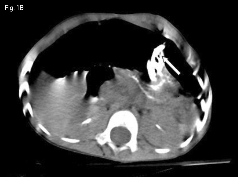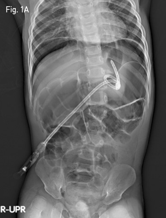 시술 다음 날 추적 관찰 단순 복부 X-ray 촬영에서 기복증이 발생하였고(Fig. 1A), 복부 CT에서는 위 전벽이 전복벽에 완전히 밀착되지 않았음을 확인하였다 (Fig. 1B). 기복증의 양이 작아 추적 관찰을 하였으나, 갈수록 양이 많아지고, 아울러 환아의 전신 상태가 나빠지기 시작하였음.