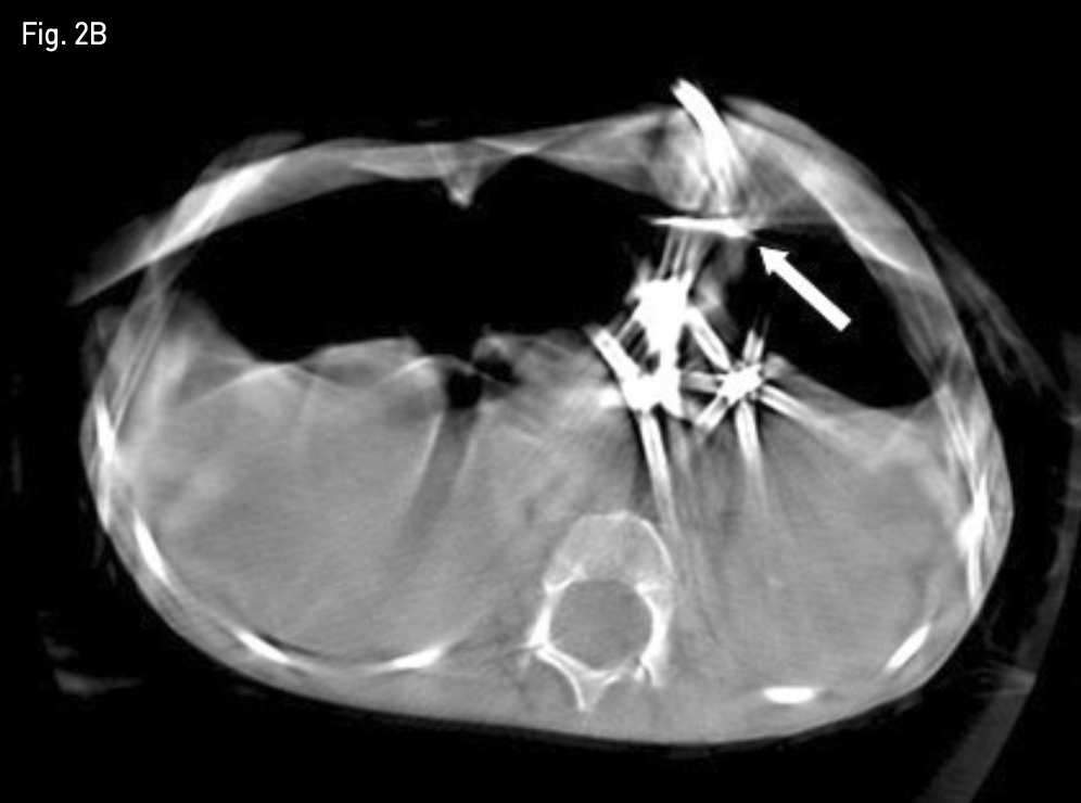 먼저 0.035-inch guide wire(Terumo, Tokyo, Japan)를 이미 거치되어 있던 12-Fr 위창냄술 튜브 (Cook, Bloomington, IN, USA)내로 진입시킨 후 제거하였다. 이후 신속히 4-Fr sheath(Cook, Bloomington, IN, USA)를 거치한 후 두 번째 T-fastener를 삽입하였고 적절한 힘으로 앞 복벽에 밀착시켰다. 이후 제시하였던 12-Fr 위창냄술 튜브(Cook, Bloomington, IN, USA)를 다시 삽입한 후 마지막으로 T자형 고정장치와 튜브를 피부에 고정하였다. 투시 장비로 측면상을 보았을 때, 첫번째 삽입하였던 T-fastener와 새로이 삽입한 T-fastener 간에 상당한 차이가 있음과, C-arm CT상 전복벽에 위전벽이 완전히 밀착되었음을 확인하였다(Fig. 2A-B). 조영제를 주입하여 튜브의 기능과 조영제의 복강내로 유출이 없음을 확인하였다.