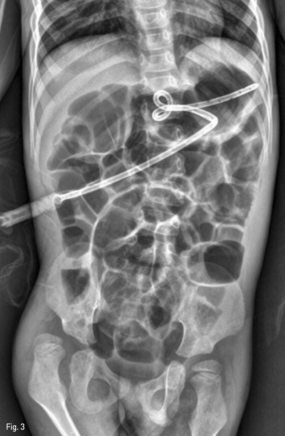뇌성마비와 후두연화증의 병력이 있는 환아로 시행한 단순 X-ray에서 마비성 장폐색 소견이 보여 비위관을 삽입하였음. 그 후 연하곤란과 체중감소가 있어 비위관 영양을 2달 간 지속하였지만 비위관이 자주 빠지는 증상이 발생하였고 원활한 식이 진행과 합병증 예방을 위하여 투시하 경피적 위창냄술(PRG)이 의뢰되었음.