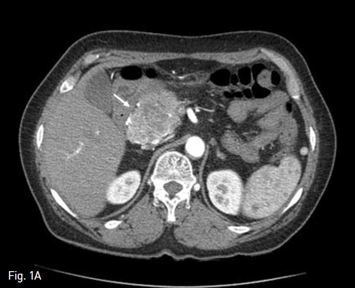 Contrast-enhanced axial abdominal CT image A shows a bulky, low attenuated mass lesion with hypervascularity in pancreatic head portion (white arrow). So, our surgeon performed pylorus-preserving pancreaticoduod enectomy with Traveso method (schema in B).