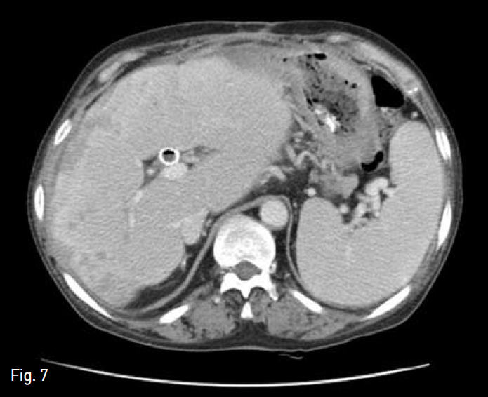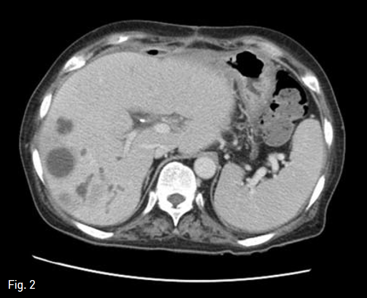 Follow-up axial abdominal CT image, obtained 4 months after medical and interventional treatment, shows size reduction of multiple abscess and decompression of bile duct. Afterthen, the patient discharged.