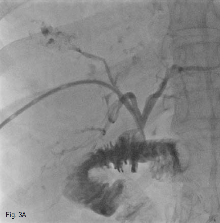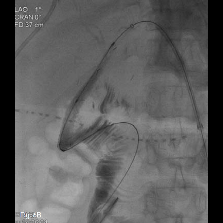 이전 시행된 좌측 경피경간 담도 배액관을 동해 담관 조영술을 시행하여 총담관 - 십이지장 분합부를 확인하고, 0.035-inch guide wire(Terumo, Tokyo, Japan)와 5-Fr KMP catheter(Cook, Bloomington, IN, USA)를 이용하여, wire를 원위부 십이지장에 거치 후, 분합부를 가로질러 직경 10mm, 길이 8cm의 Anti-reflux designed, GD type biliary stent(TaeWoong Medical, Gimpo, Korea)를 설치하였다(Fig. 6B). 시술 후 담관조영술을 통해 스텐트의 개방성과 적절한 위치를 확인 한 후, 추적 관찰을 위해 다시 8.5-Fr pigtail형drainage catheter(Cook, Bloomington, IN, USA)을 거치하였다.