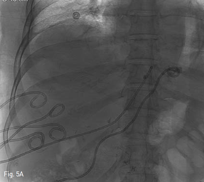 응급실 재방문 후 시행한 복부 전산화 단층촬영상 양측 간엽에 1~3cm크기의 다발성 간농양이 15일 전 퇴원 시 보다 다소 크기의 증가가 보이고, 농양 배액을 위해 다수의 농양 배액술(Fig. 5A) 및 담즙 우회를 위해 좌측 경피경간 담도 배액술(Fig. 5B)이 시행되었다. 이후 내과 및 외과 의료진과 상의 후 역행성 간농양에 대한 Anti-reflux designed, GD type stenl(Fig. 6A)를 계획하였다.