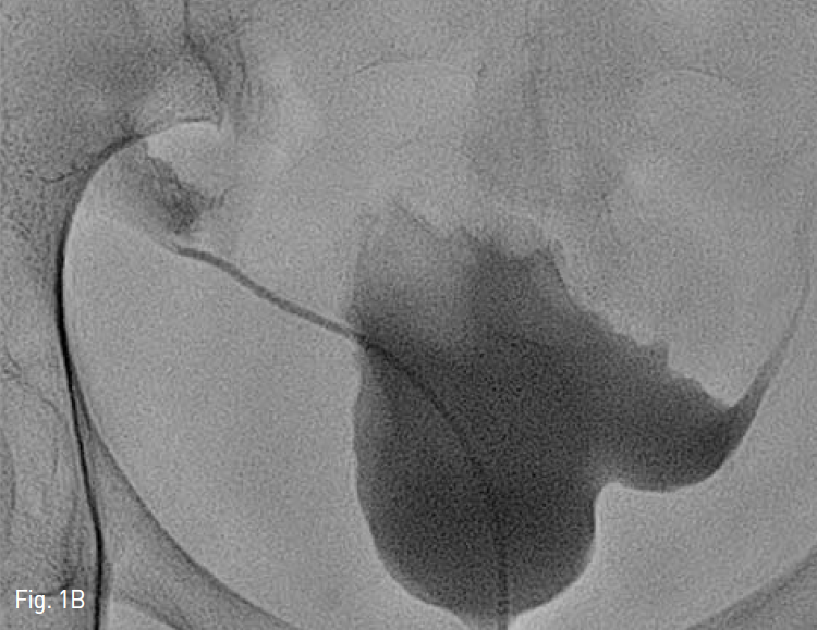 경정맥 신우조영술과 방광조영술에서 좌측 요관 원위부에서 다양의 조영제 유출이 관찰되었다. 소변길 전환을 위해 경피적 신루설치술(PCN)을 우선적으로 시행하였다.