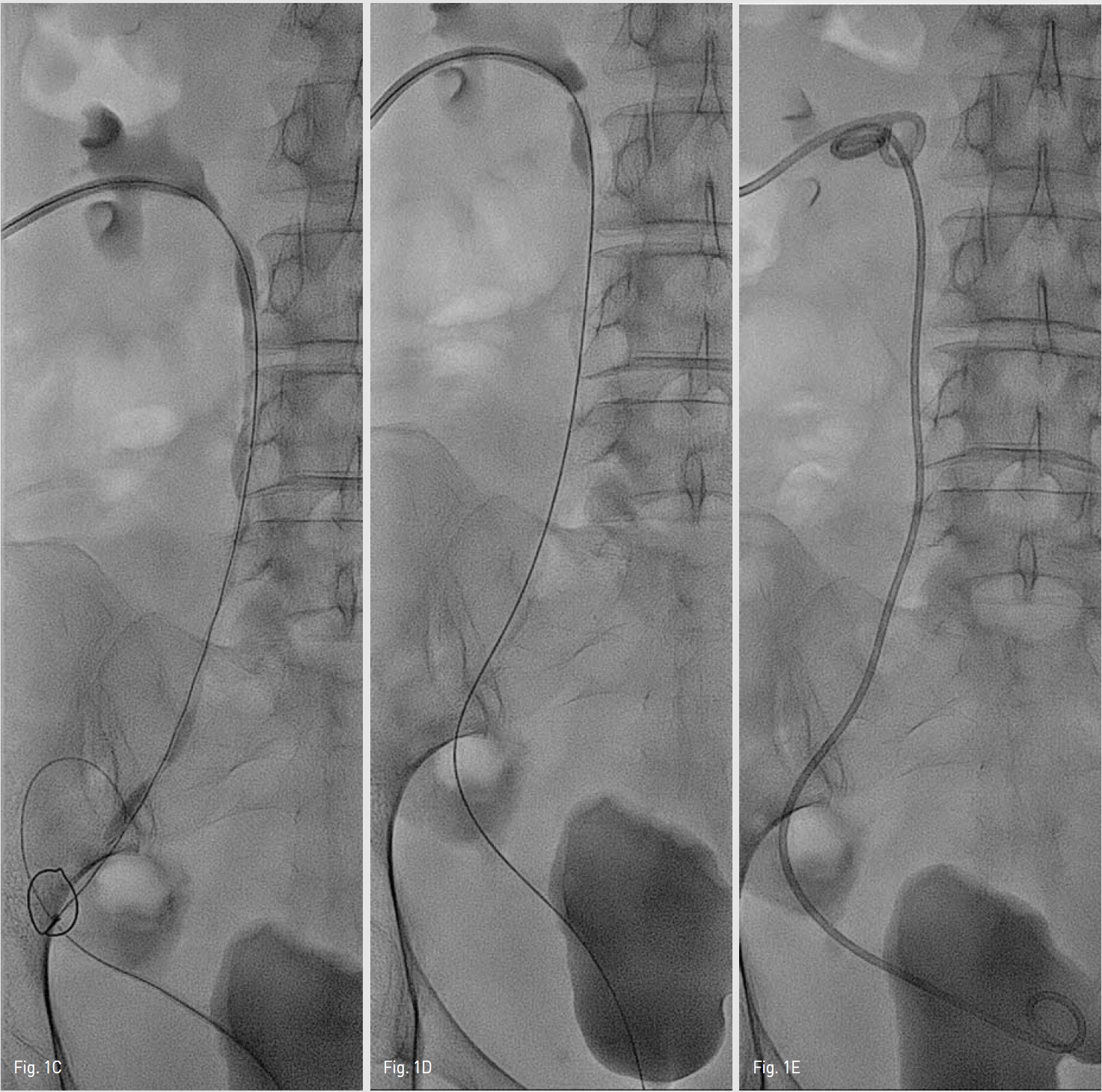 진입되었다. 방광 내로 5-Fr Kumpe catheter와 0.035 인치 유도철사를 삽입하여 아래쪽에서 역행성으로 요관에 유도철사 진입을 시도하였으나 여시 유도철사가 후복막으로 빠졌다. 경피적 신루설치술 부위를 통해 하행성으로 Gooseneck snare(ev3, Plymouth, MN, USA)를 삽입하여 후복막에 진입시킨 후 방광을 통해 역행성으로 유도철사를 삽입 시켜 후복막으로 진입시켰다. 이 유도철사를 하행성으로 삽입한 Gooseneck snare로 포획하여(Fig. 1C) 경피적 신루설치술 부위로 제거하고(Fig. 1D), 이 유도철사를 따라 성공적으로 7-Fr, 28cm double J stent(Cook, Bloomington, IN, USA)를 삽입한 후 PCN 도관을 설치하고(Fig. 1E) 시술을 미쳤다.