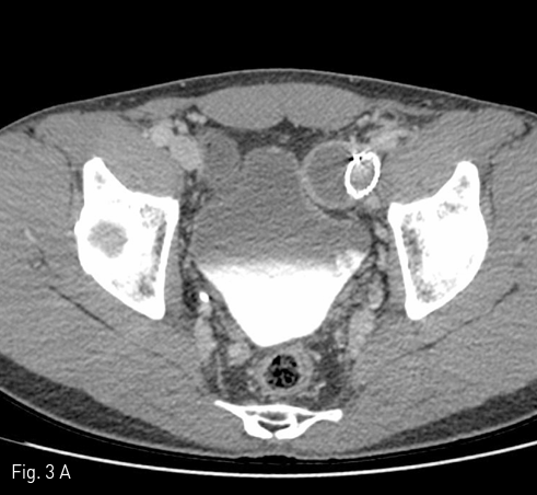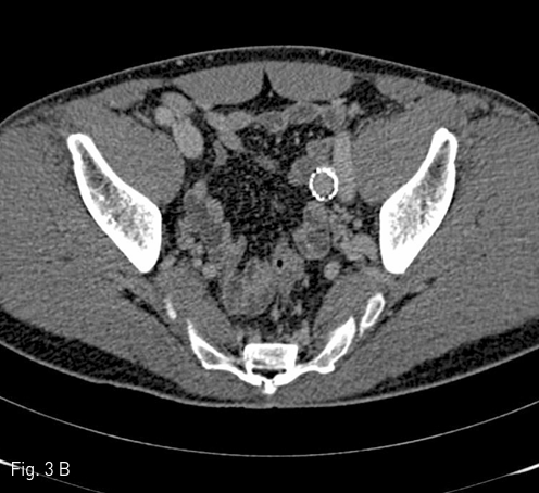 좌측 외장골정맥 aneurysm에 대한 스텐트-그라프트 설치 8개월 뒤 CT 상 aneurysm의 크기가 약 3.5 X 3.3 X 3.0 cm로 감소하였으며 (Fig. 3A), 3년 5개월 뒤 CT에서 aneurysm이 거의 남아 있지 않았다 (Fig. 3B)