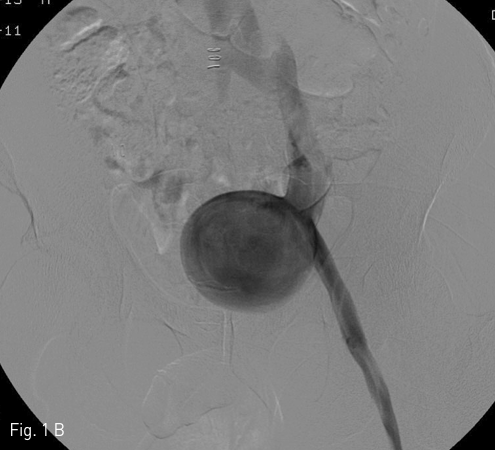 야뇨증상과 좌측 하복부 종괴에 대한 평가를 위해 시행한 CT에서 좌측 골반강에 약 5.6 X 5.2 X 7.4 cm 크기의 경계가 뚜렷하고 조영증강을 보이는 병변이 있으며, 방광의 전외측을 압박하고 있었다. 이 병변은 외장골 정맥과 연결되어 있고, 외장골 정맥과 동일한 정도의 조영증강을 보였다 (Fig. 1A). 좌측 하지에서 시행한 정맥조영술에서 좌측 외장골 정맥에서 기인하는 saccular aneurysm이 확진되었다 (Fig. 1B).
