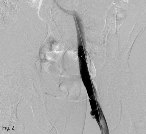 After stent-graft placement, venography shows successful exclusion of aneurysm from the left external iliac vein.