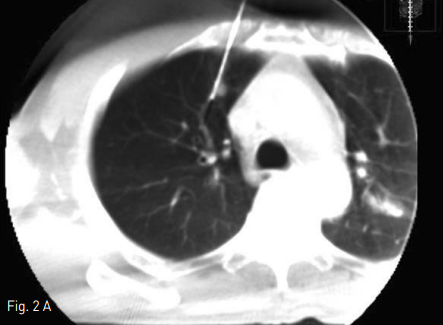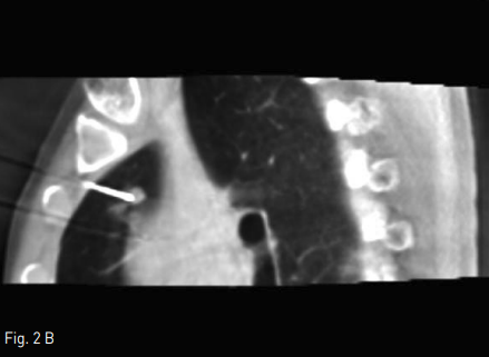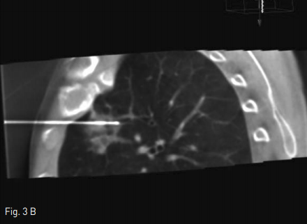 Axial & sagittal cone beam CT (CBCT) scan show well targeted an electrode to the pulmonary nodule in RUL.