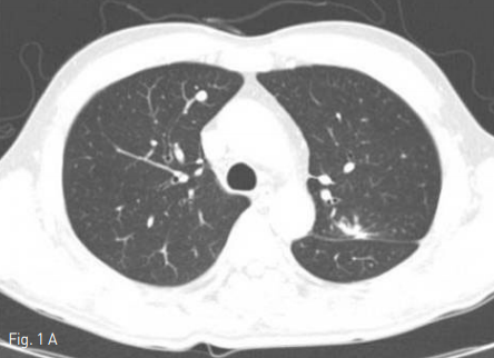 폐전이암 절제술 후 추적검사상 흉부 전산화 단층촬영에서 우측 폐 상엽에 0.7cm가량의 조영 증강되는 폐결절이 새롭게 관찰 되었다.(Fig. 1)
