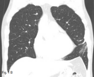 Axial & coronal CT scan show a 0.7x0.5 cm sized enhancing solitary pulmonary nodule in right upper lobe.